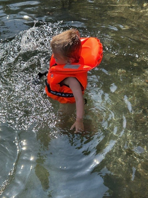 Sommeren har vært varm og god, og bading er noe alle er glade i på hvert sitt vis. En trilling bader helst bare opp til baken, den andre vil helst ikke ha vann i ansiktet og den tredje hopper fra brygga og møter vannet uten frykt. Enda en aktivitet trillingene er så forskjellige på. De er trillinger, men jeg begynner mer og mer å se på dem som søsken, siden de er like - ulike.