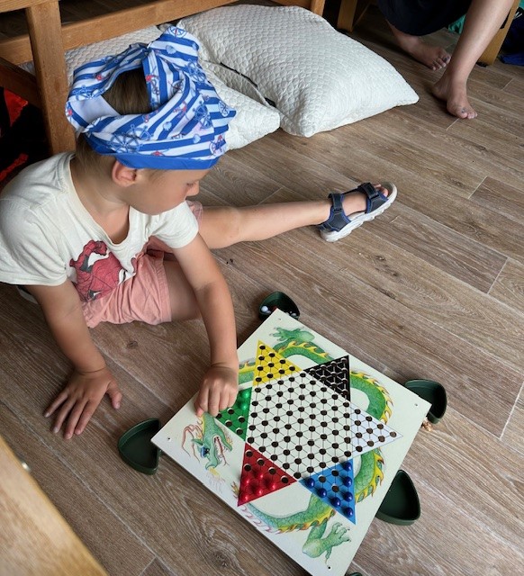 Klar for et bad - alltid greit å vite hvor en har de viktige tingene, derfor badebuksen på hodet - må bare spille kinasjakk først.