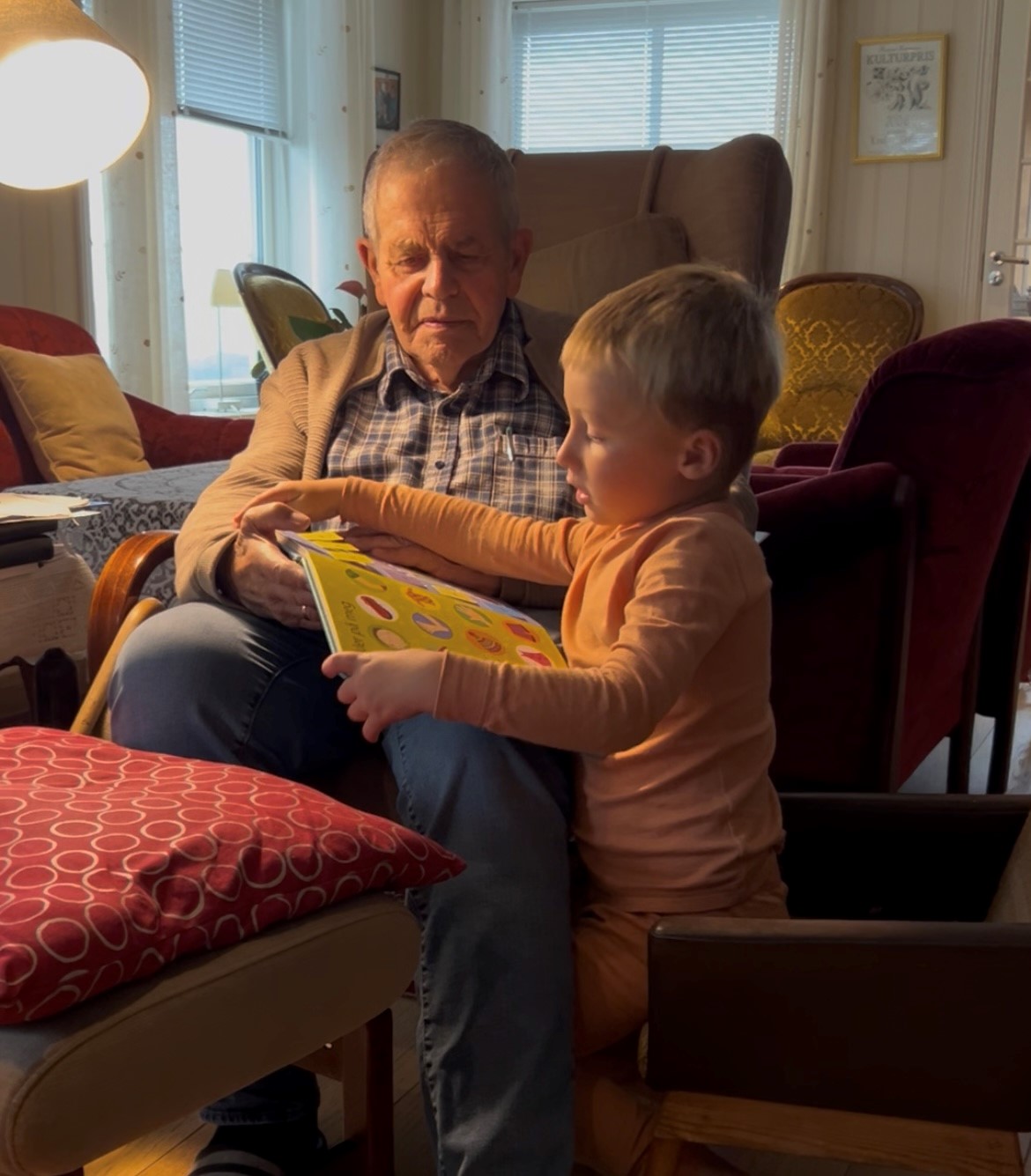 Vi snakker full julebuss-stemning på veien hjem i kveldsmørket. Med interiørlys som nektet å slå seg av etter at små fingre hadde trykket på alt som kunne trykkes på og beveges på. I baksetet nynnet trillingguttene på sine forkjellige favorittsanger …. samtidig, mens Oldefar prater rolig som om dette er helt normalt. Og det er det.