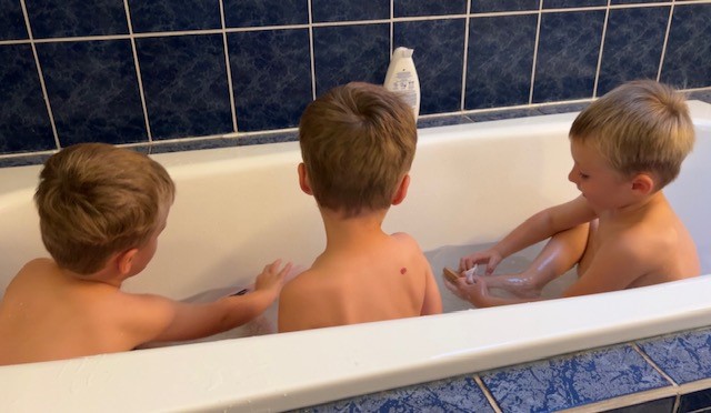 Trillingguttene på ferie hos Mimmi, bade i badekaret er obligatorisk.