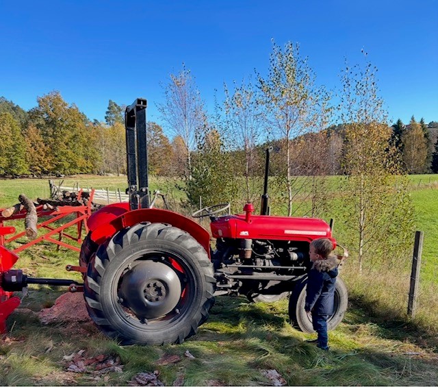 Grandonkels traktor er noe av det kuleste!! Trillinggutt ser nøye på vidunderet før han klatrer opp.